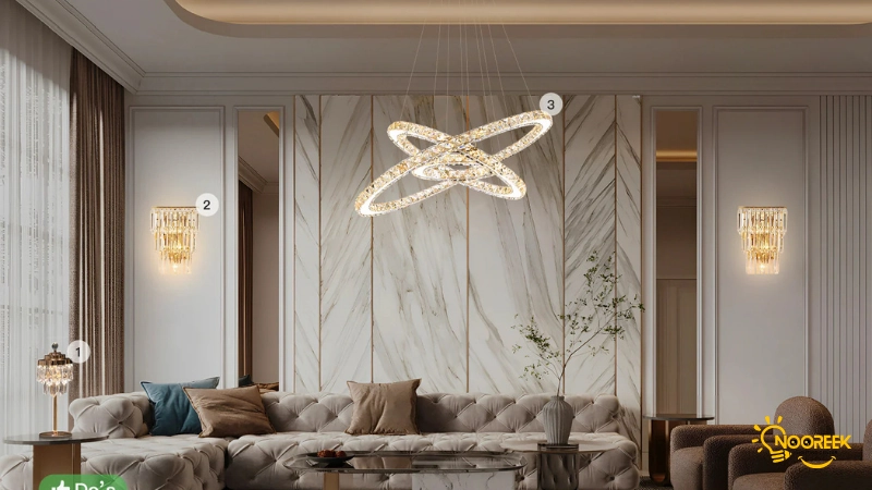 این ترکیب به‌ویژه در فضاهای بزرگ یا اتاق‌هایی با سقف بلند بسیار مؤثر است. لوسترهای سقفی فضای کلی را روشن کرده و لوسترهای دیواری می‌توانند به ایجاد نور ملایم‌تر در گوشه‌ها و دیوارها کمک کنند، به‌ویژه در نواحی که به نور بیشتری نیاز دارند. به‌علاوه، این ترکیب می‌تواند جلوه‌ای جالب و مدرن در دکوراسیون ایجاد کند، زیرا تضاد میان لوسترهای سقفی و دیواری باعث می‌شود که فضای شما دینامیک و جذاب به نظر برسد.
