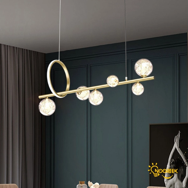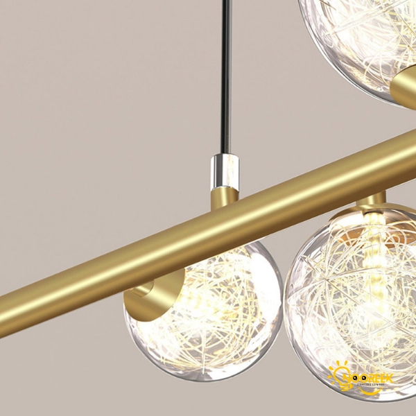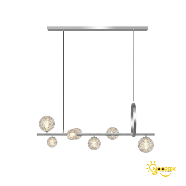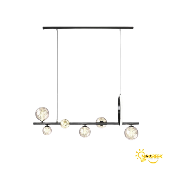 حبابهای شیشهای این لوستر بهطور منحصر بهفرد با ریسههای آلومینیومی تزئین شدهاند که علاوه بر زیبایی ظاهری، نور را بهطور یکنواخت در فضا پخش میکنند. این طراحی دقیق و زیباییشناسی، نه تنها به لوستر جلوهای شیک و مدرن میبخشد، بلکه عملکرد آن را نیز بهینه کرده و نورپردازی یکپارچهای ایجاد میکند.
