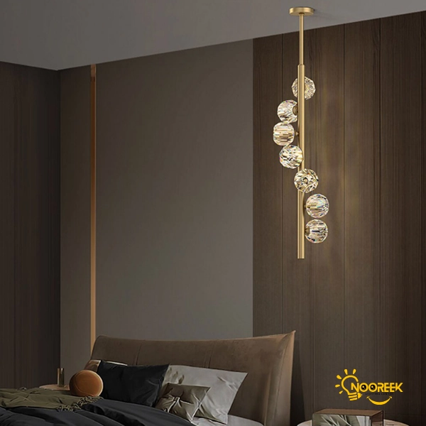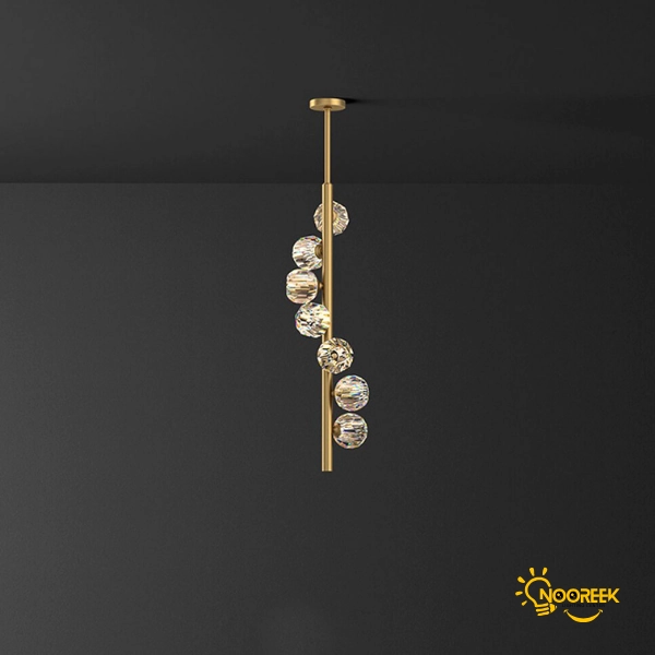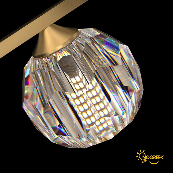در زمان روشن بودن، انعکاس نور از کریستالهای شفاف و درخشان، فضایی گرم، زنده و مجلل ایجاد میکند و حس آرامش و شکوه را در محیط گسترش میدهد. در حالت خاموش نیز ظاهر مینیمال و طلایی رنگ آن، با سطحی براق و صیقلی، جلوهای ظریف و مدرن به فضا میبخشد.